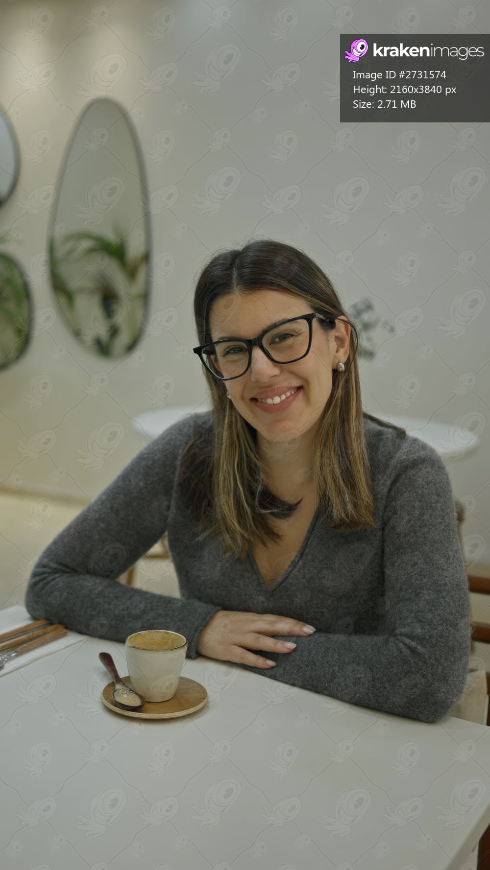 Woman enjoying coffee indoors at a modern luxury restaurant, showcasing the elegant interior and serene ambiance while sitting at a white table with minimalist decor. - Kraken Images