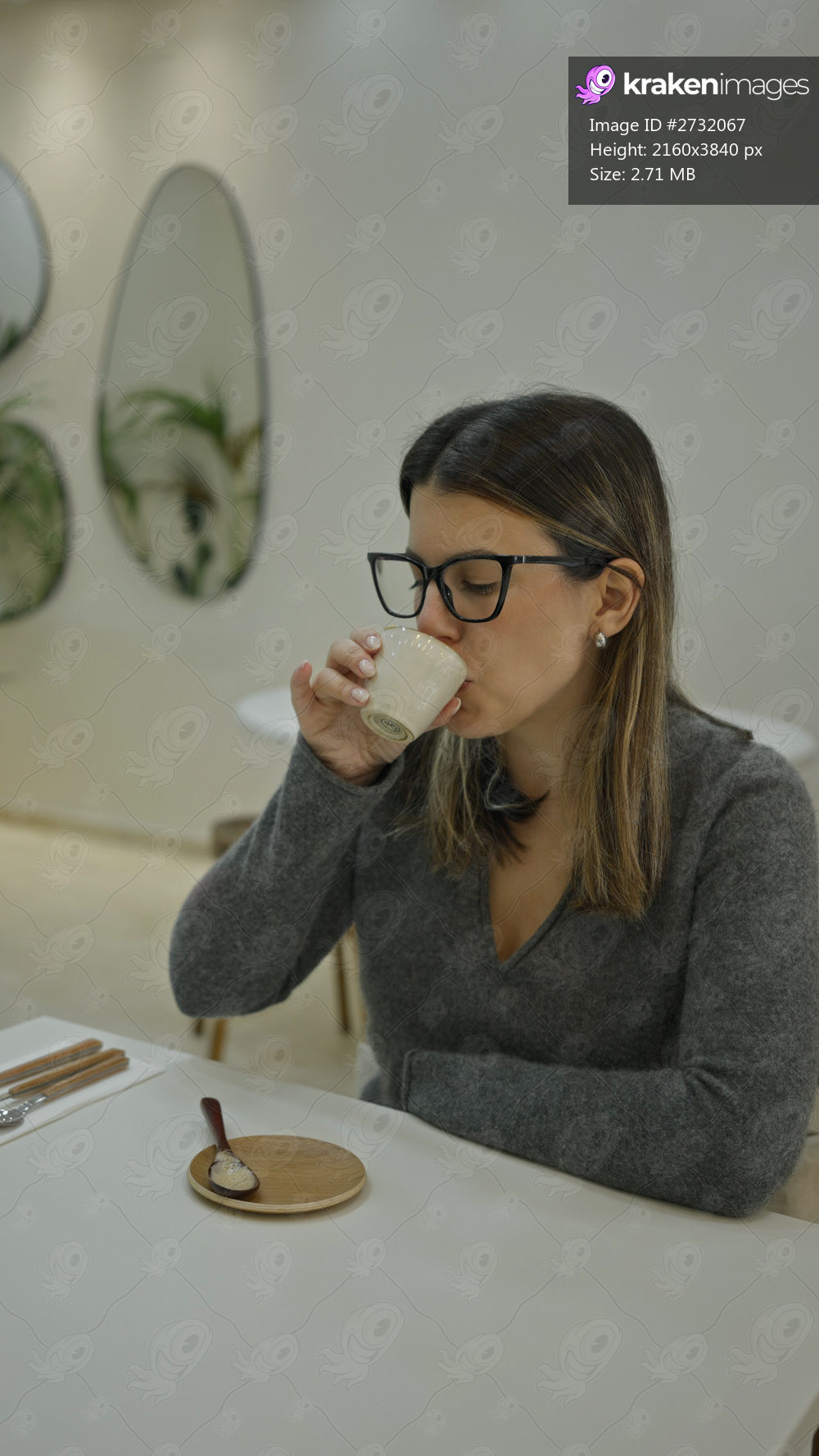 Woman enjoying coffee indoors at a modern luxury restaurant, showcasing the elegant interior and serene ambiance while sitting at a white table with minimalist decor. - Kraken Images