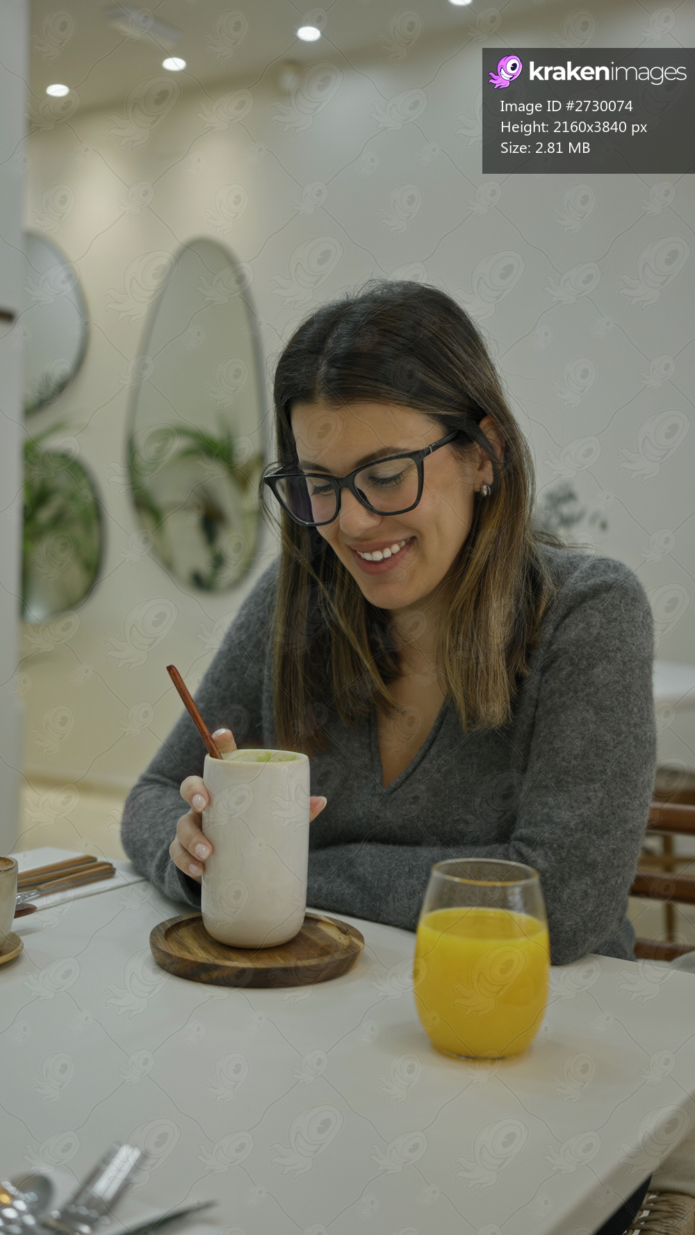 Woman enjoying coffee indoors at modern luxury restaurant with bright lighting, featuring stylish decor and relaxed atmosphere, sipping beverage quietly while seated. - Kraken Images