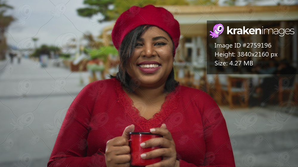 Woman enjoying coffee outdoors on a city terrace dressed in vibrant red, embodying happiness and warmth, captivating urban vibes with her smile and comforting surroundings. - Kraken Images