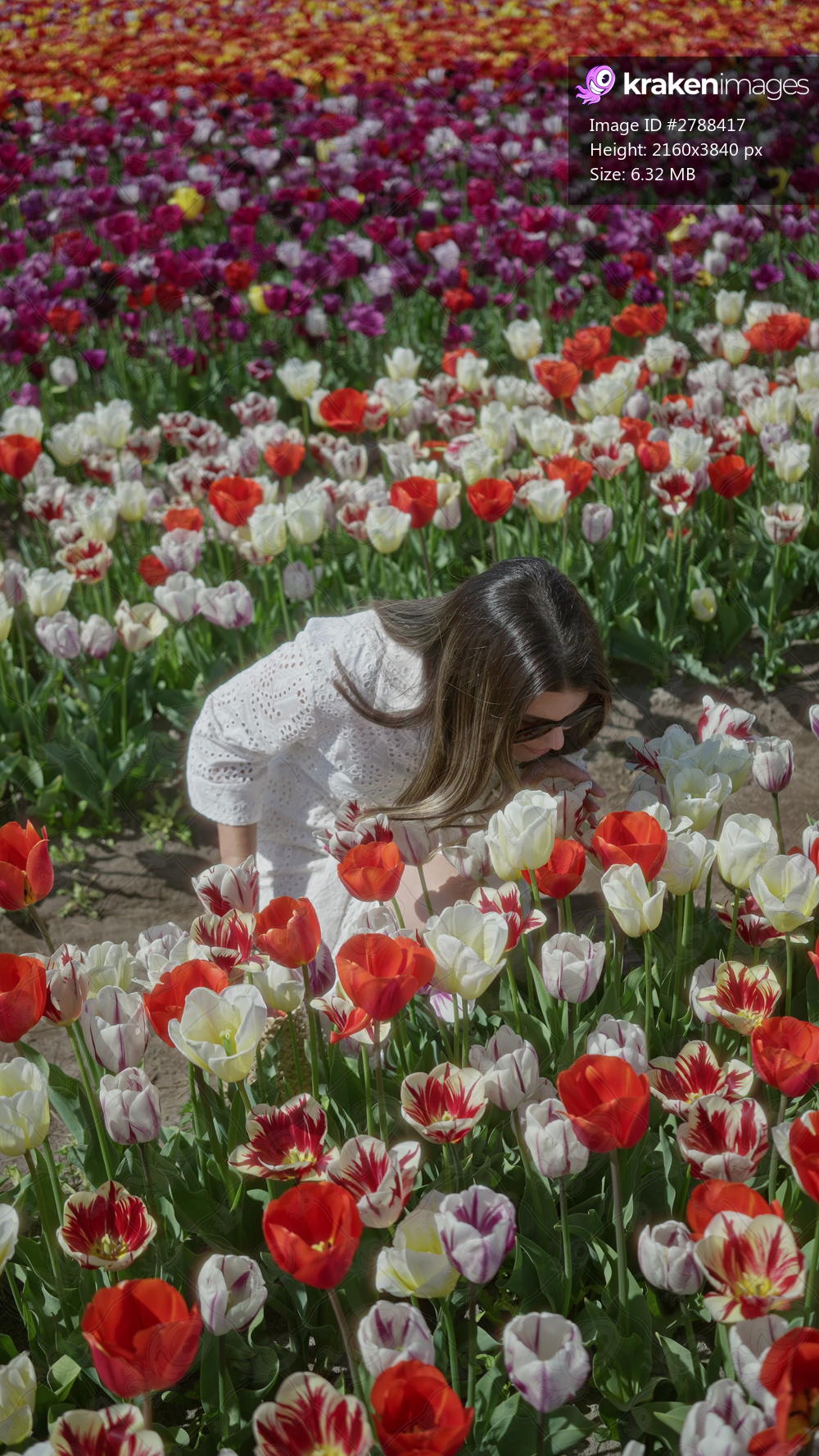 Woman enjoying colorful tulip field in lisse, netherlands, wearing a white dress and sunglasses, surrounded by vibrant flowers in a sunny spring landscape. - Kraken Images