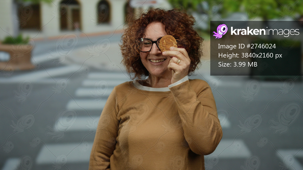 Woman enjoying cookie outdoors on a city street, showcasing joyful expression, curly brunette hair, wearing glasses, blending urban backdrop with a relaxed, cheerful demeanor.