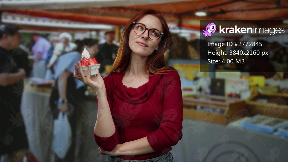 Woman enjoying dessert in outdoor market wearing glasses and red sweater with ice cream in hand among blurred people under canopies