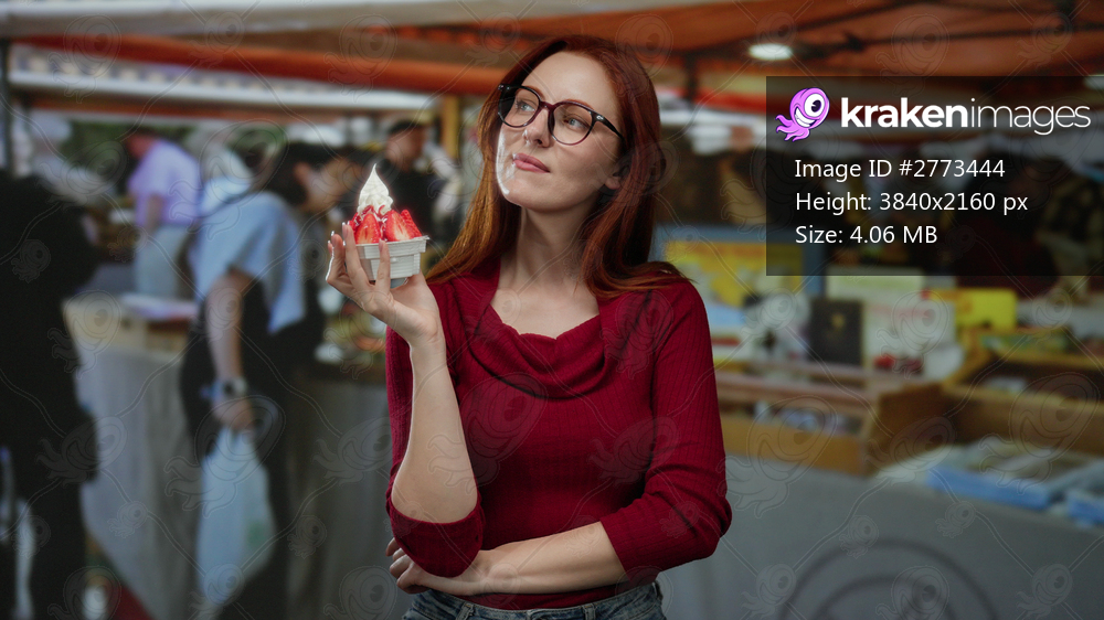 Woman enjoying dessert in outdoor market wearing glasses and red sweater with ice cream in hand among blurred people under canopies