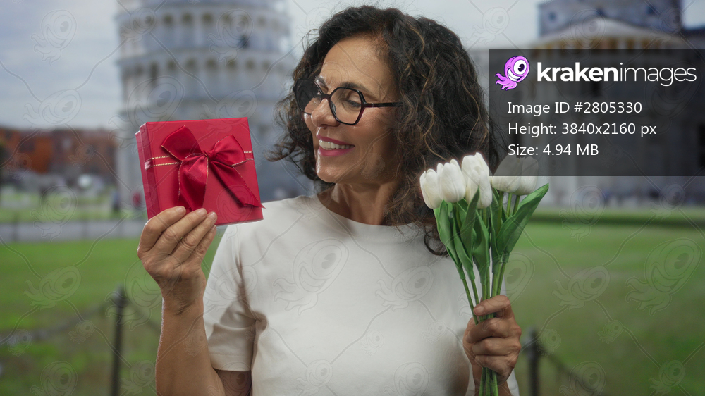 Woman enjoying flowers and gift box in front of pisa tower outdoors italy.