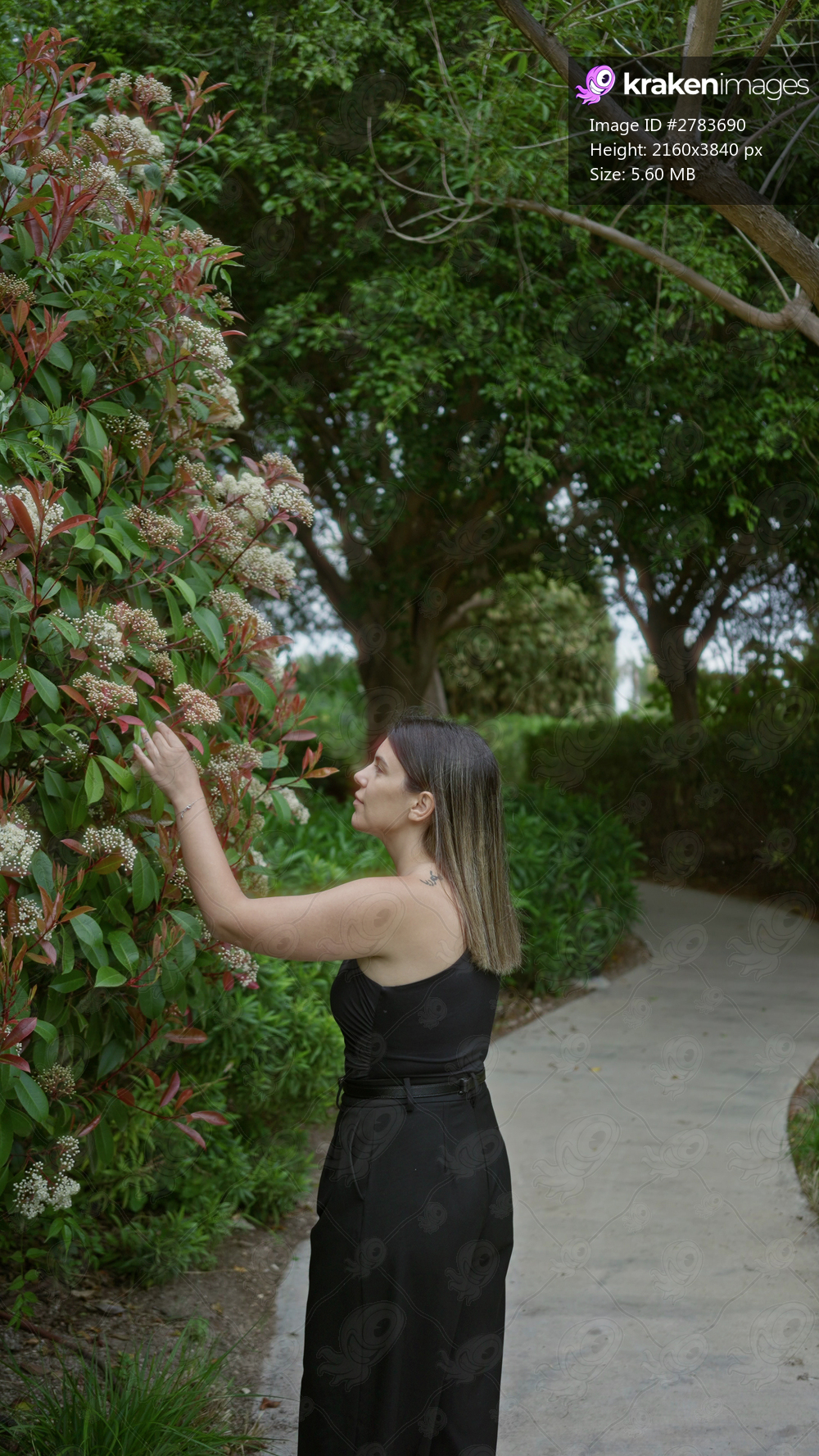 Woman enjoying fragrant flowers at a luxury tropical resort garden walkway surrounded by lush greenery and vibrant blossoms during a serene afternoon stroll. - Kraken Images