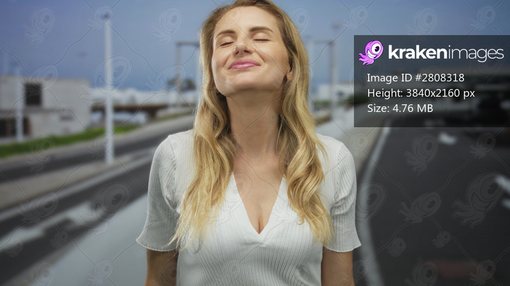 Woman enjoying fresh air on highway, blonde hair and smiling expression adds to relaxed outdoor atmosphere, with clear sky and empty road surroundings. - Kraken Images