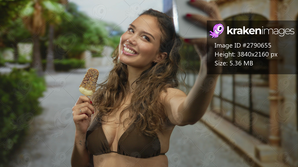 Woman enjoying ice cream outdoors takes selfie wearing bikini capturing summer joy with smartphone, highlighting relaxed lifestyle in sunny environment