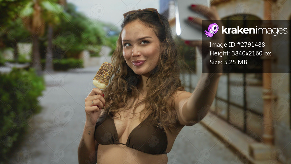 Woman enjoying ice cream outdoors takes selfie wearing bikini capturing summer joy with smartphone, highlighting relaxed lifestyle in sunny environment
