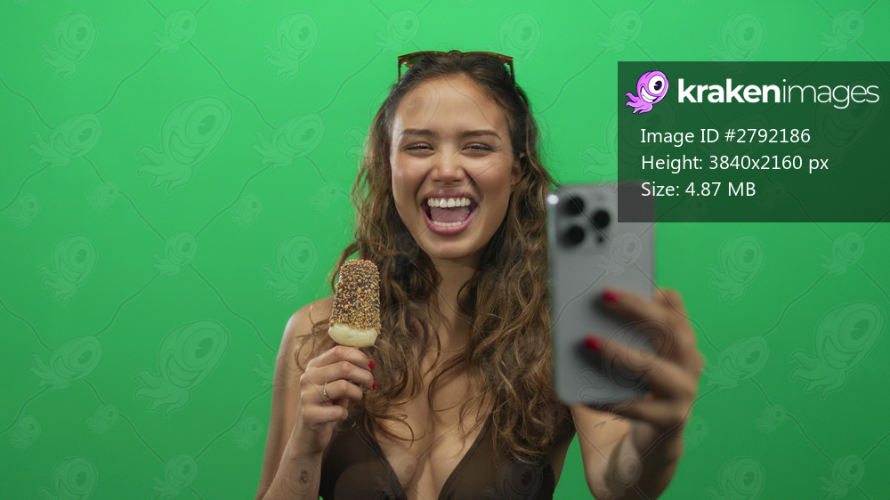 Woman enjoying ice cream while taking selfie with smartphone in swimwear against green background, capturing youthful and joyful summer vibes outdoors. - Kraken Images
