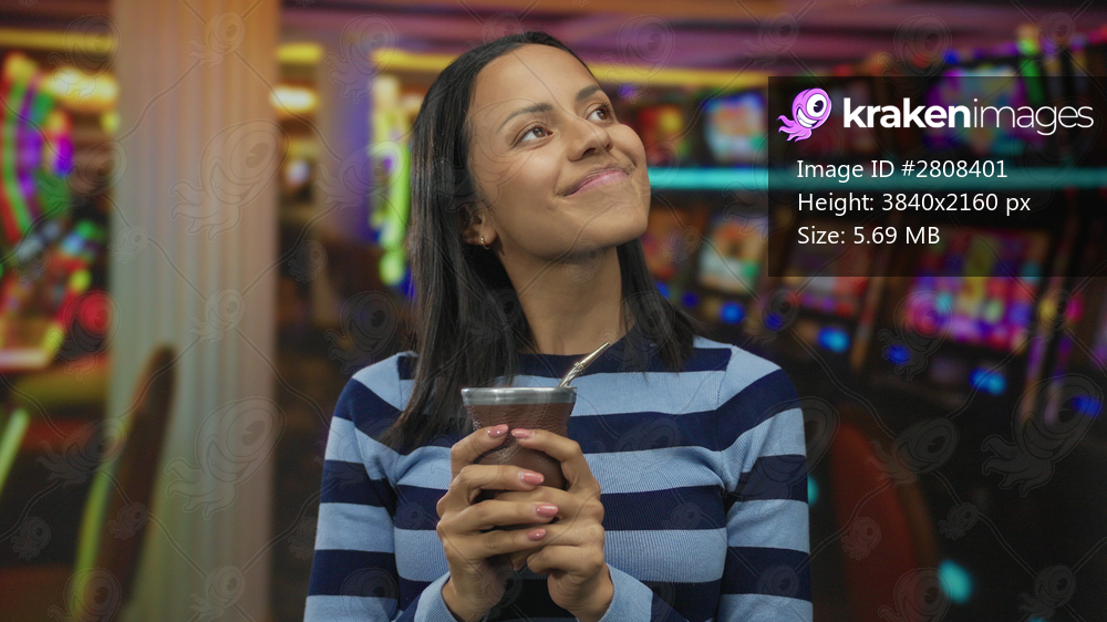 Woman enjoying mate at casino, relaxed atmosphere with slot machines in background, capturing youthful joy in an engaging indoor setting.