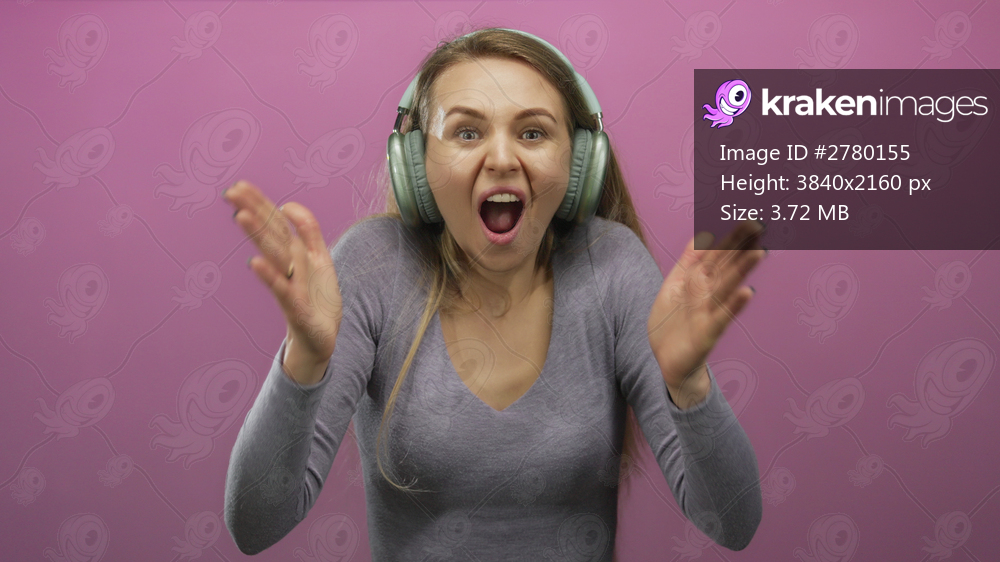 Woman enjoying music with headphones against an isolated pink background, expressing surprise and delight, wearing casual gray top, communicating happiness and vibrant energy - Kraken Images