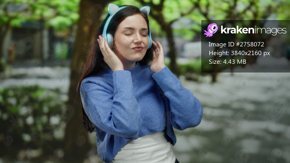 Woman enjoying music with headphones in a sunny park setting, wearing a blue sweater amidst green trees, capturing a moment of relaxation and tranquility outdoors. - Kraken Images