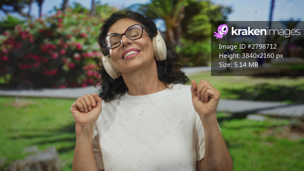 Woman enjoying music with headphones in a sunny park, surrounded by lush greenery and flowers, wearing glasses and a white shirt, smiling and feeling relaxed. - Kraken Images
