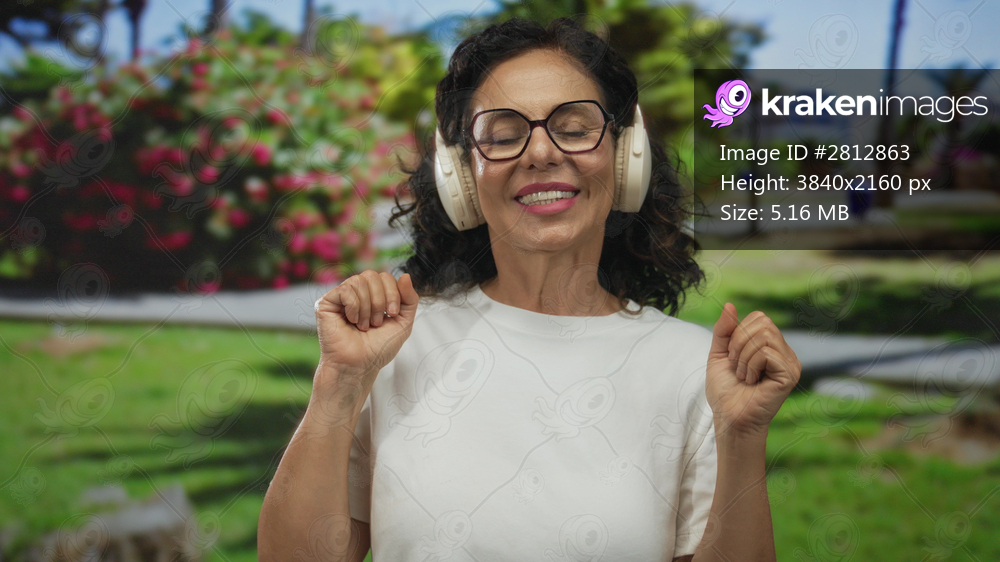 Woman enjoying music with headphones in a sunny park, surrounded by lush greenery and flowers, wearing glasses and a white shirt, smiling and feeling relaxed. - Kraken Images
