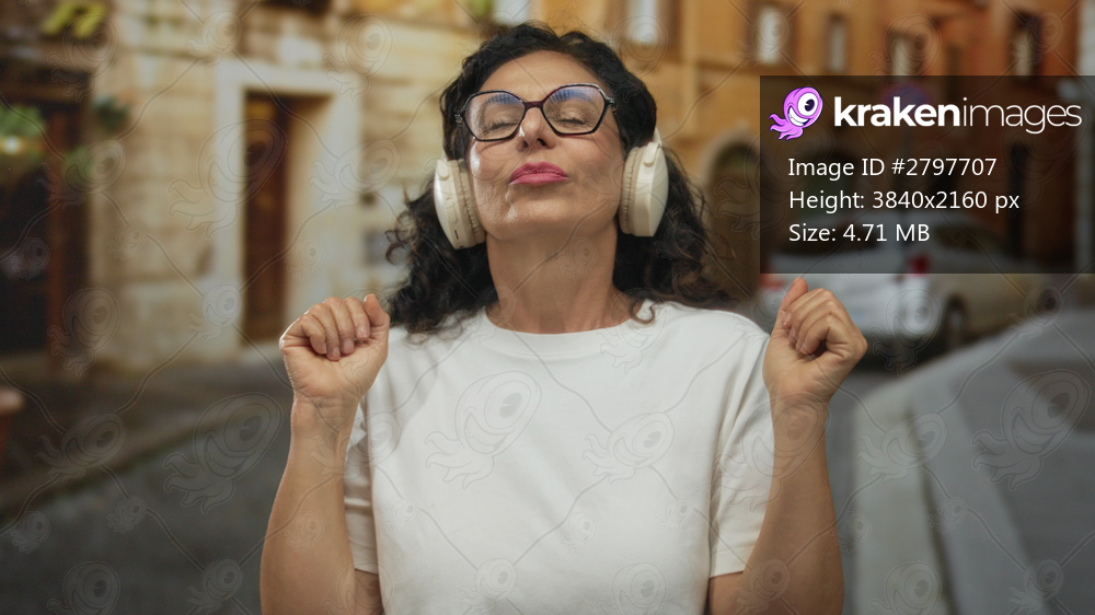 Woman enjoying music on headphones with a joyful expression standing on a lively street, showcasing urban life and middle age happiness outdoors in a casual setting. - Kraken Images