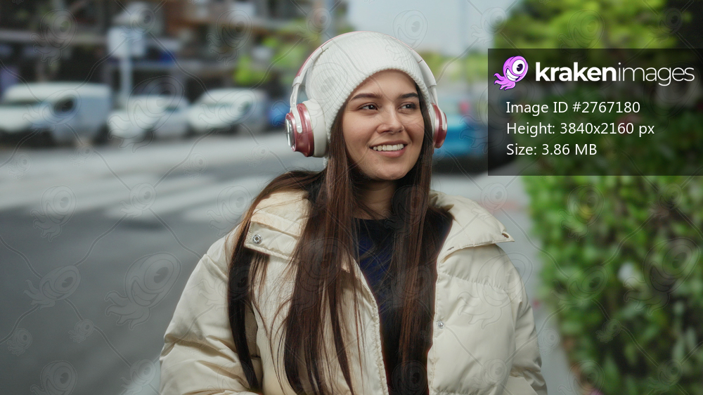 Woman enjoying music on headphones with a smile in a street scene, wearing a winter jacket and beanie outdoors, illustrating technology use in urban environments. - Kraken Images