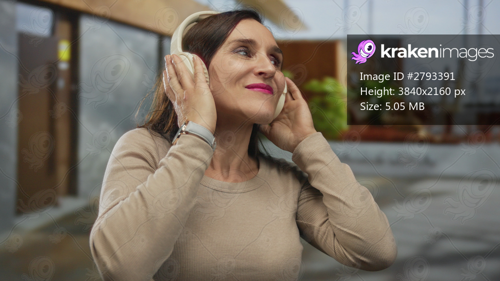 Woman enjoying music outdoors with headphones smiling in a relaxed garden setting wearing casual attire reflecting happiness and tranquility.