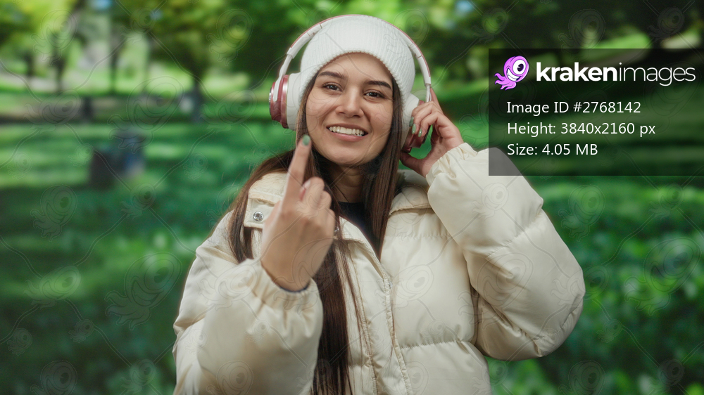 Woman enjoying music outdoors in a park, wearing headphones and a white beanie, smiling and counting with fingers, showcasing young hispanic adult lifestyle in a vibrant natural setting. - Kraken Images