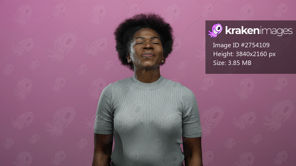 Woman enjoying peaceful moment standing on isolated pink background with eyes closed, conveying calm expression.