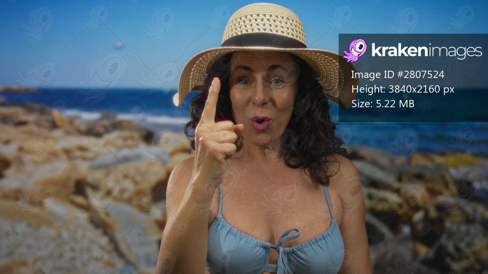 Woman enjoying sunny beach day wearing a bikini and hat, smiling and cheerful by the seaside on a clear day outdoors.