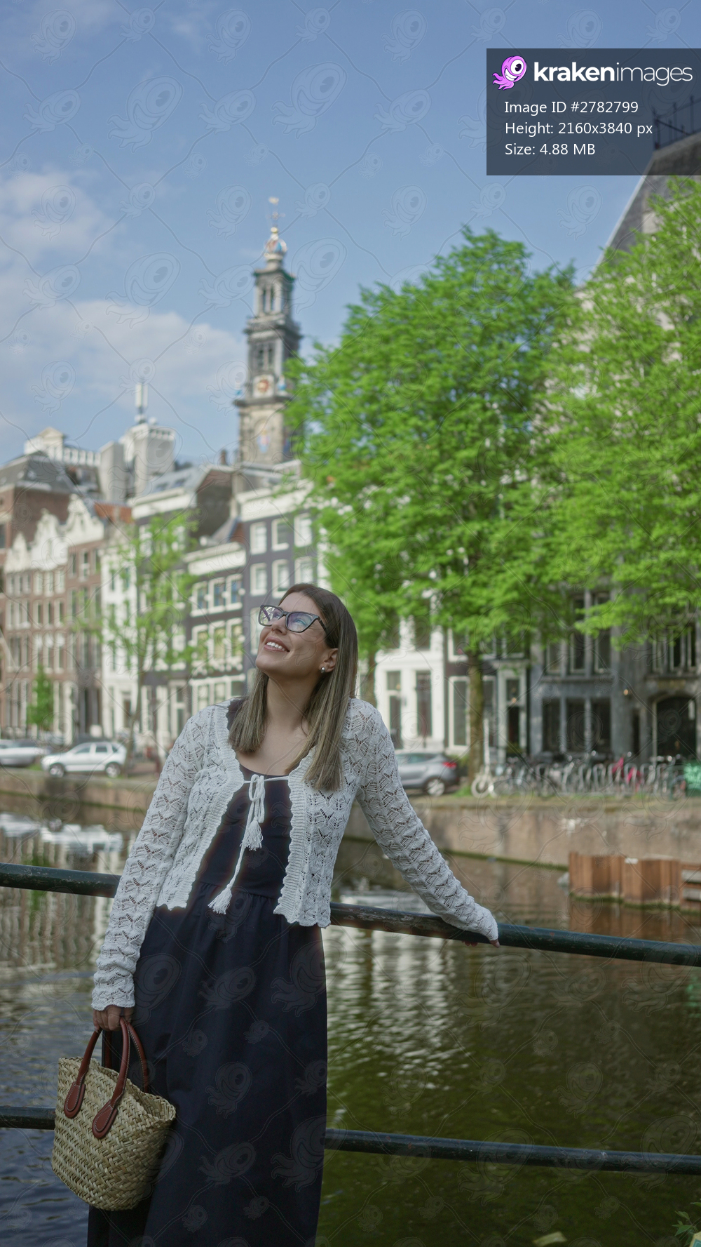 Woman enjoying sunny day in amsterdam by canals with historic buildings in background holding wicker bag smiling happily under blue sky.