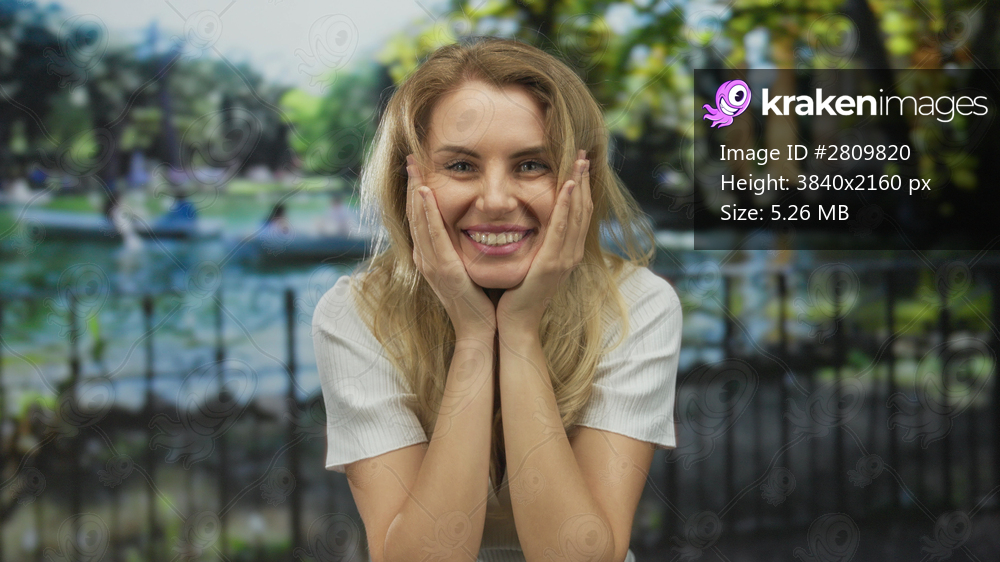 Woman enjoying sunny day in park surrounded by greenery with happy expression and hands on face showcasing delight and amazement
