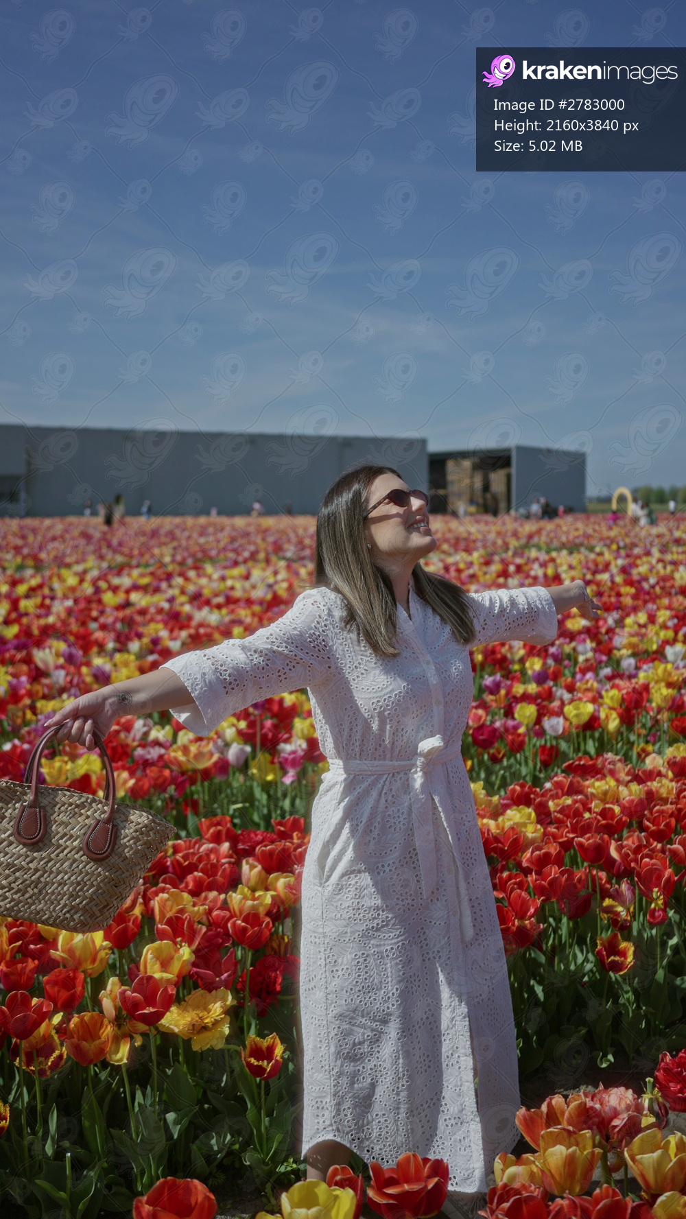 Woman enjoying sunny day in vibrant tulip field in lisse, netherlands, surrounded by colorful flowers, wearing white dress, sunglasses, and holding straw bag. - Kraken Images