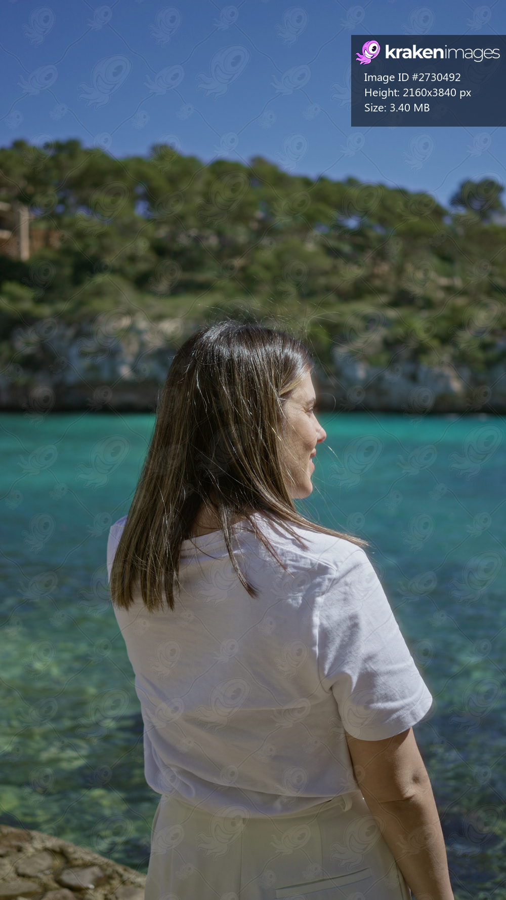 Woman enjoying the scenic view at a mediterranean beach in santanyi, mallorca, under a clear blue sky.