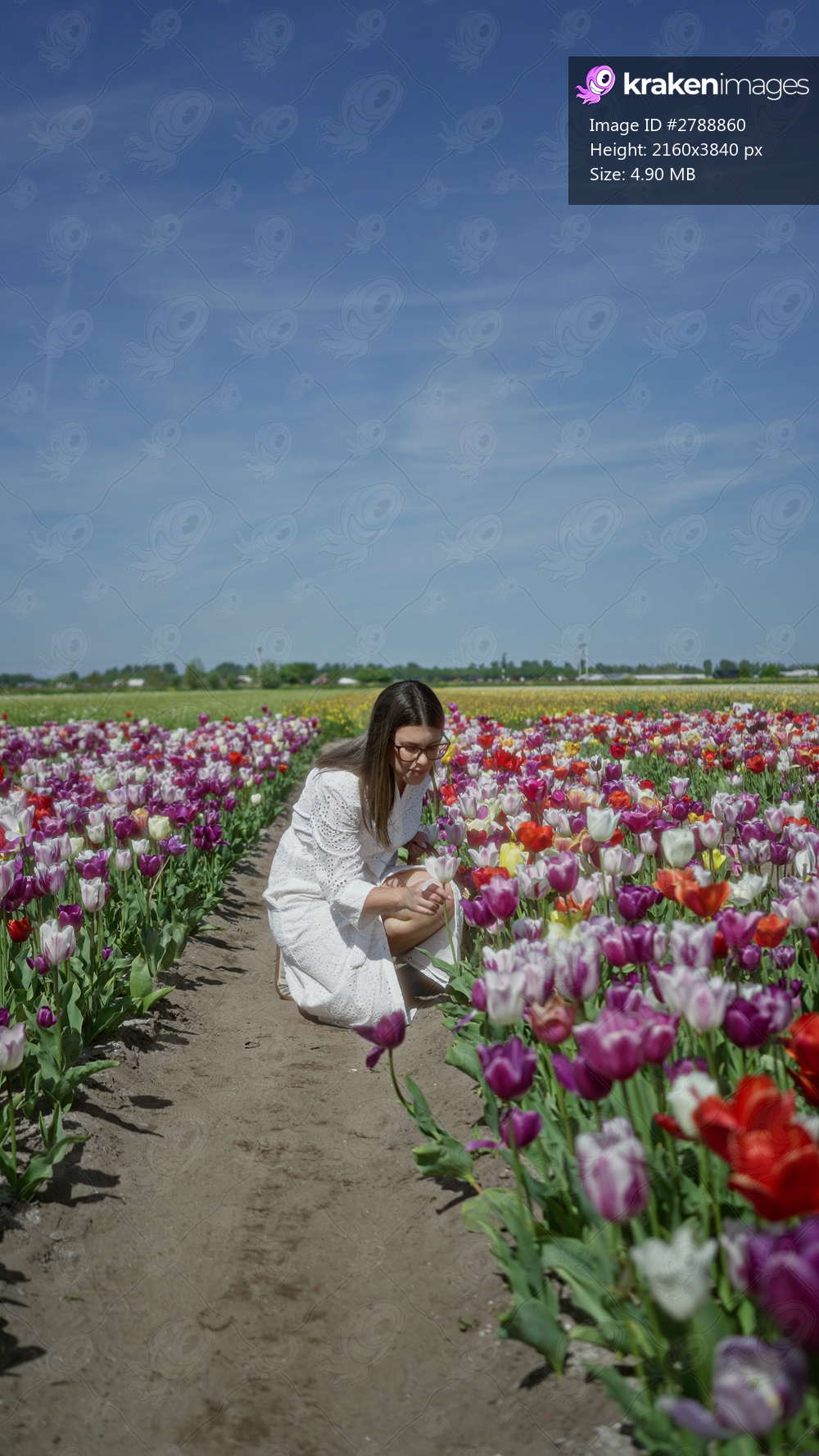 Woman enjoying tulip field in lisse netherlands under clear blue sky surrounded by vibrant flowers capturing springtime beauty
