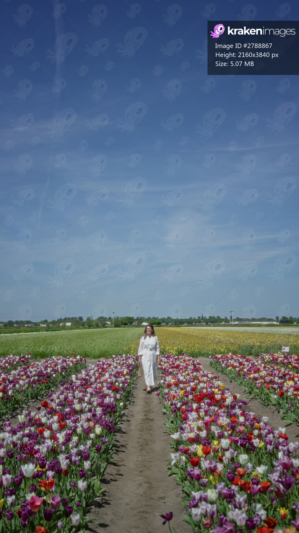 Woman enjoying tulip field in lisse netherlands under clear blue sky surrounded by vibrant flowers capturing springtime beauty