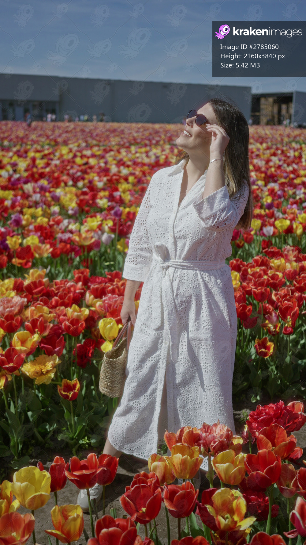 Woman enjoying tulip field with vibrant flowers in lisse, netherlands, wearing white dress and sunglasses, carrying straw bag under sunny sky.