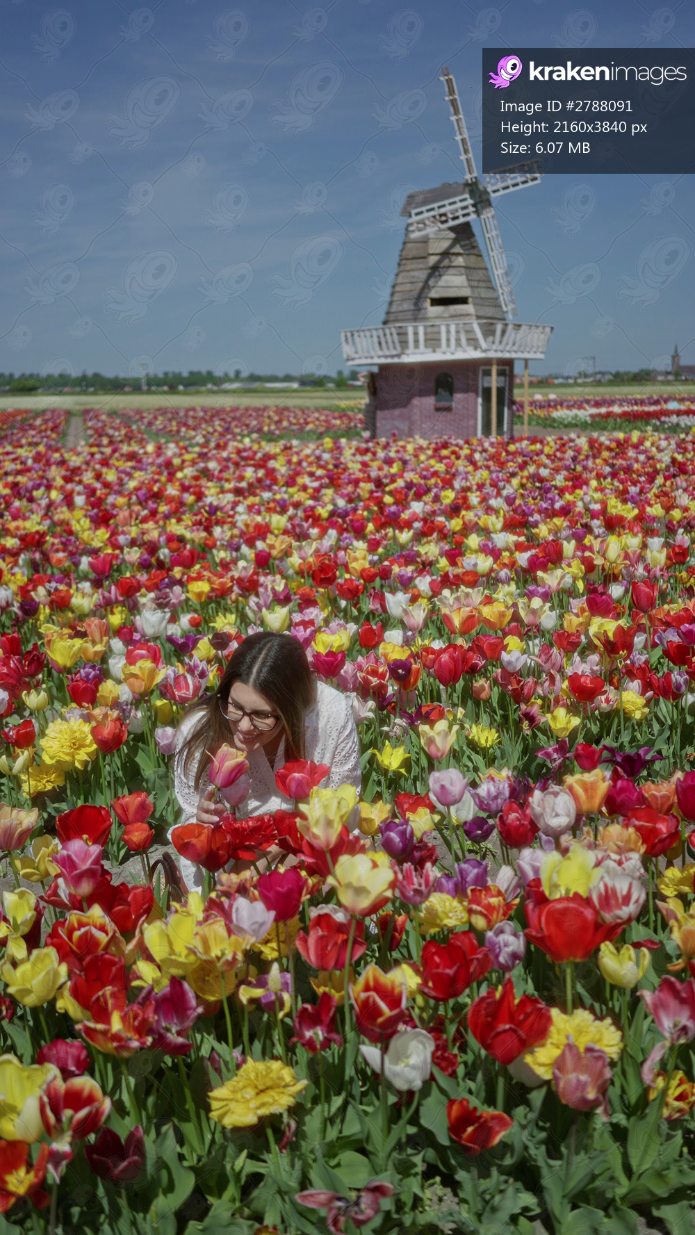 Woman enjoying vibrant tulip field with windmill in lisse, netherlands, showcasing colorful flowers and clear skies during springtime.