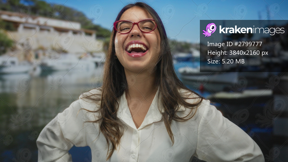 Woman enjoys sunny seaside setting, smiling brightly near boats in a scenic port with a cheerful expression and stylish red glasses emphasizing youthful energy. - Kraken Images