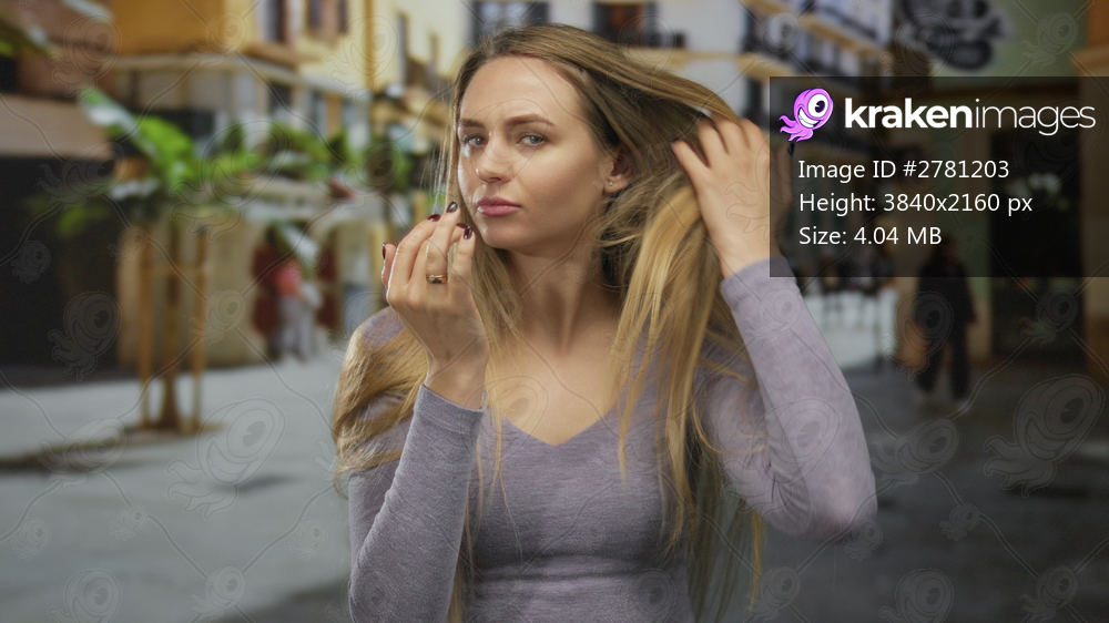 Woman examining long hair outdoors on a sunny urban street surrounded by buildings and palm trees with a thoughtful expression.