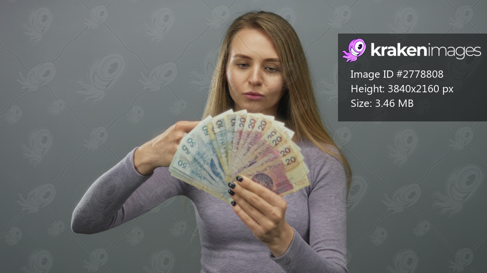 Woman examining polish zloty banknotes against a grey background, showcasing currency and financial concepts in an isolated setting.