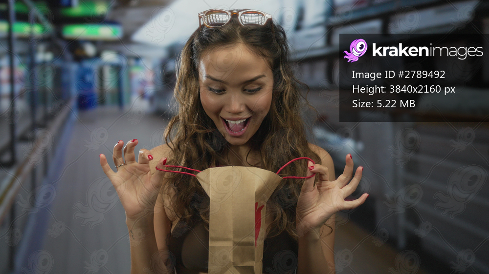 Woman excited holding paper bag on cruise ship deck with blurred background, indicating tropical vacation with young carefree hispanic energy in swimwear outdoors. - Kraken Images