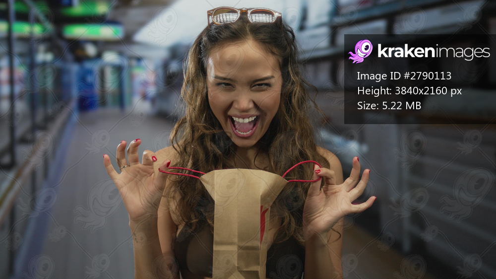 Woman excited holding paper bag on cruise ship deck with blurred background, indicating tropical vacation with young carefree hispanic energy in swimwear outdoors. - Kraken Images