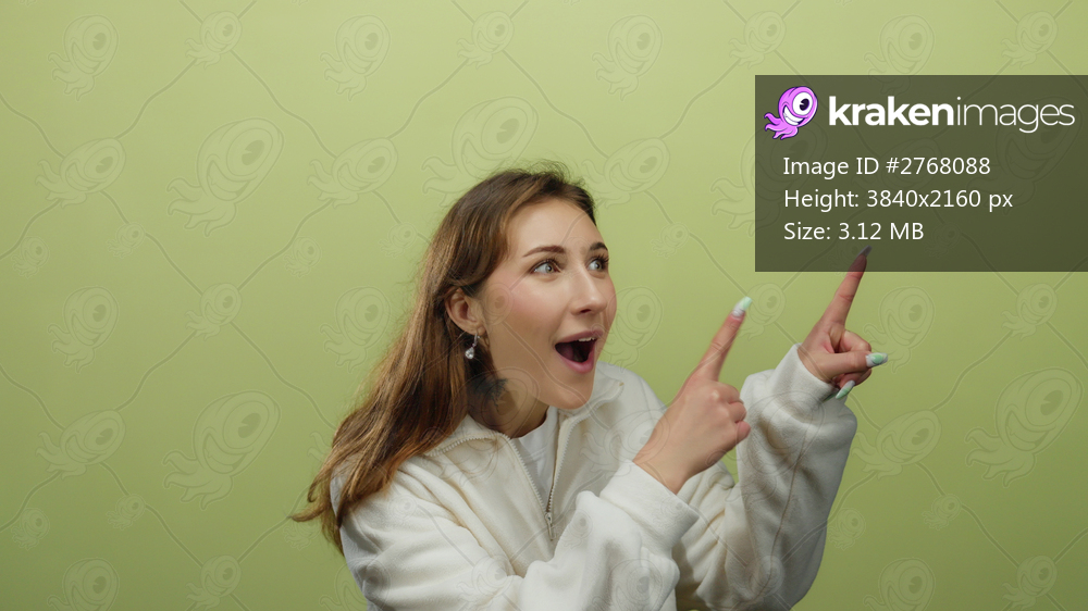 Woman excitedly pointing with both hands on a yellow background, wearing a white sweater, conveying surprise and excitement, isolated over a vibrant wall. - Kraken Images