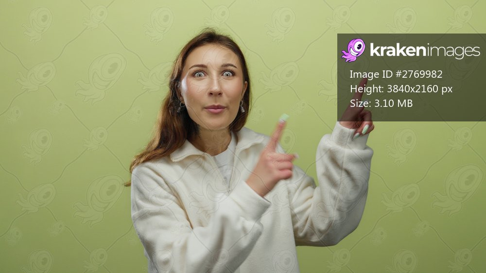 Woman excitedly pointing with both hands on a yellow background, wearing a white sweater, conveying surprise and excitement, isolated over a vibrant wall. - Kraken Images