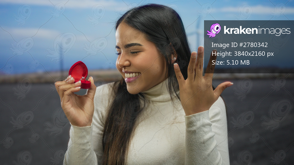 Woman excitedly showing engagement ring in a red box with windmills in the background, highlighting the joy of a proposal in a scenic outdoor field.