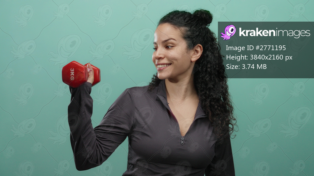 Woman exercising with dumbbell on blue background showcasing fitness and strength, isolated and smiling confidently with curly hair and sportswear.