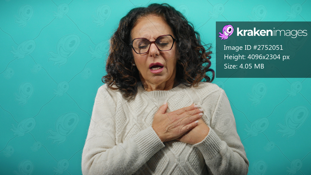 Woman experiencing discomfort holding chest with curly hair against blue background wearing sweater looking distressed isolated mature hispanic adult