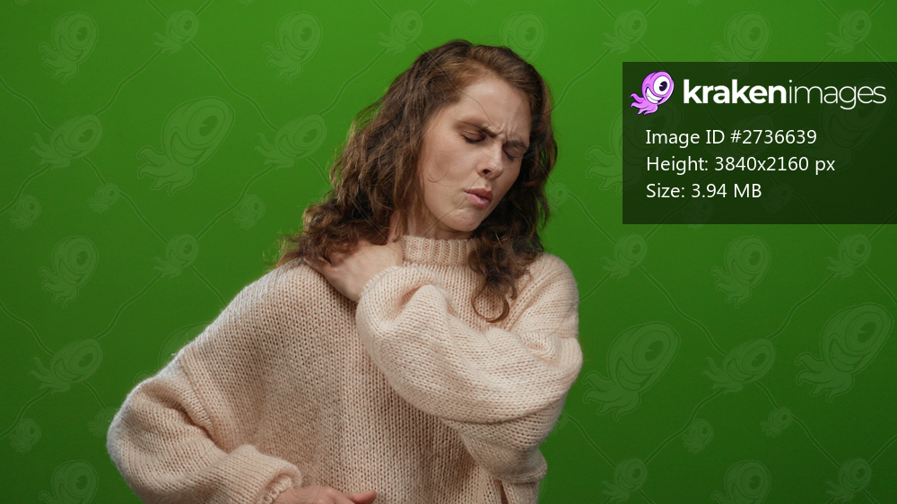 Woman experiencing neck pain wearing a cozy sweater against an isolated green background, conveying discomfort in a neutral setting, emphasizing posture and expression. - Kraken Images