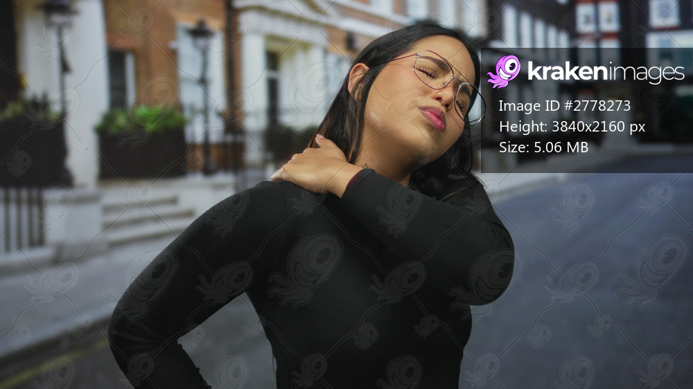 Woman experiencing shoulder pain outdoors on an urban street, showcasing discomfort in her expression, wearing glasses, and dressed in black.