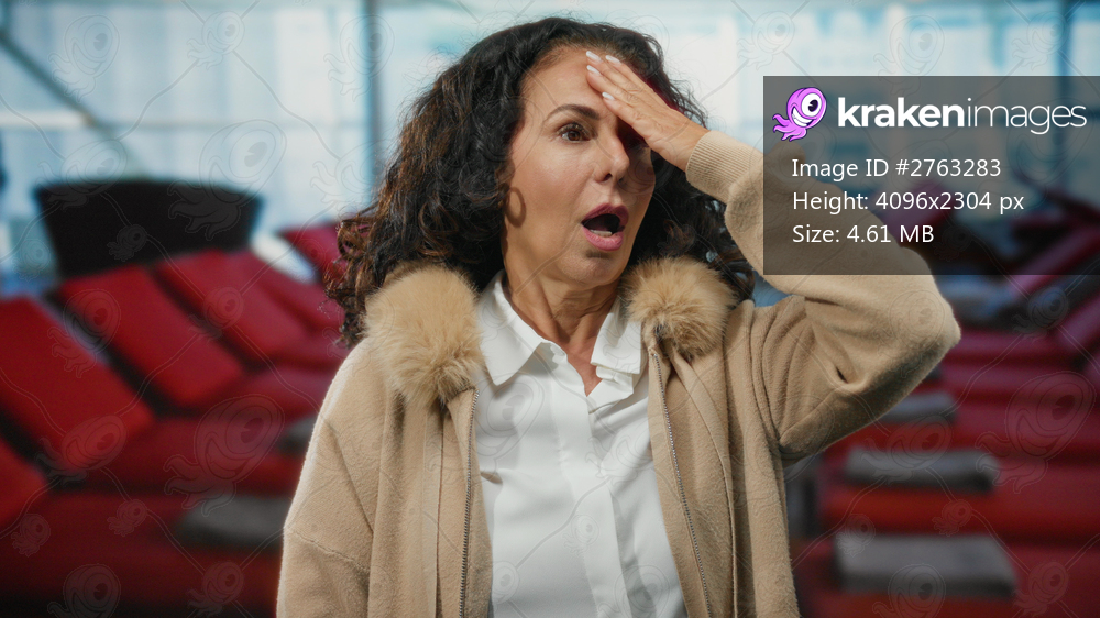 Woman experiencing surprise on a boat with outdoor seating, showcasing her middle age beauty with curly hair and hispanic features in a vibrant port setting. - Kraken Images