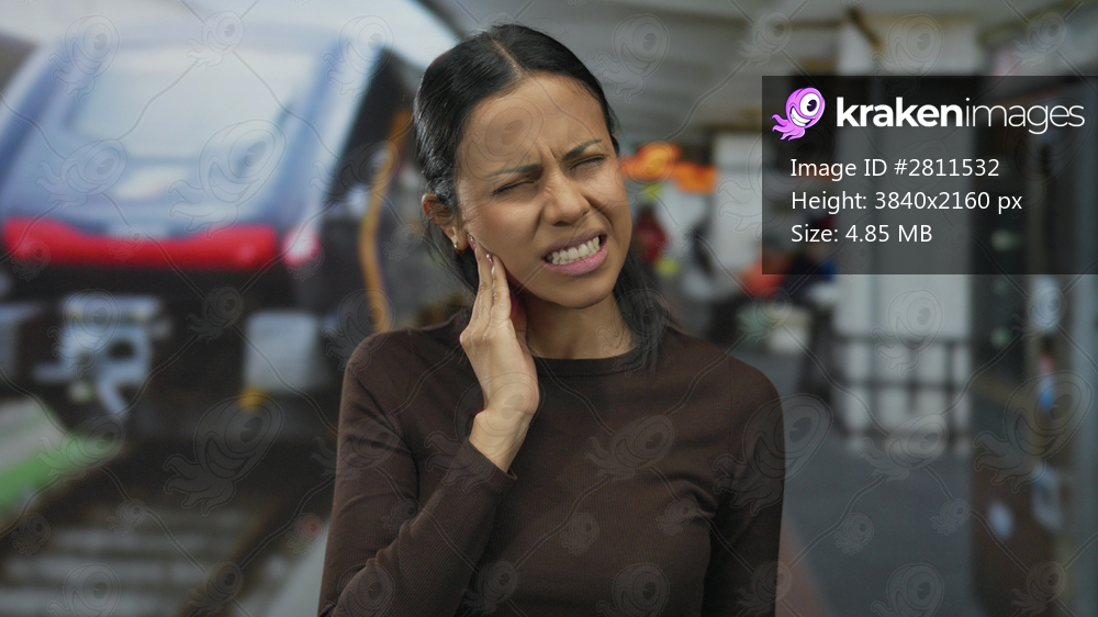 Woman experiencing toothache at train station with modern train in background, illustrating urban discomfort and travel stress.