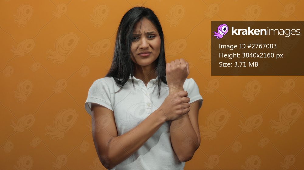 Woman experiencing wrist pain against an orange background, expressing discomfort and concern with a focus on health and emotion.