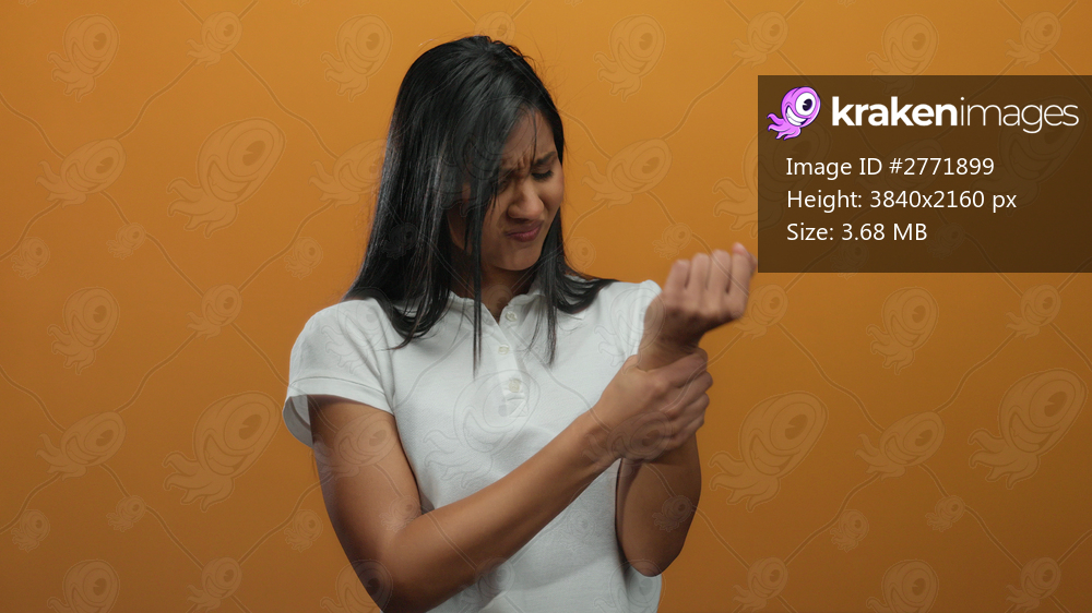 Woman experiencing wrist pain against an orange background, expressing discomfort and concern with a focus on health and emotion.