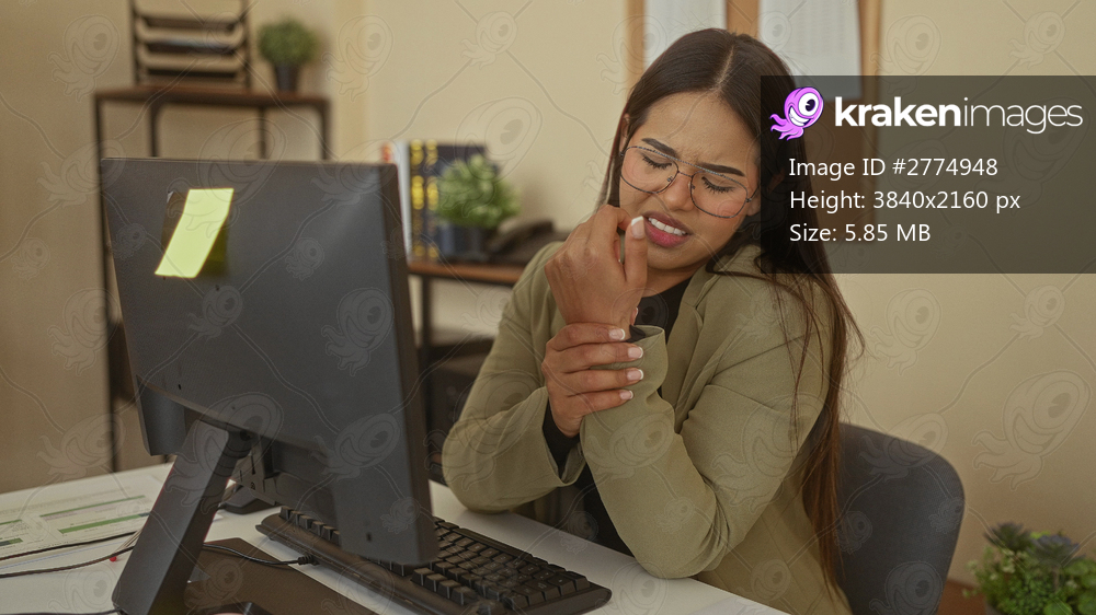 Woman experiencing wrist pain in an office setting, showcasing discomfort while seated at a computer workstation, her workplace environment includes office supplies and decor. - Kraken Images